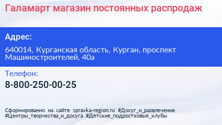 Галамарт, магазин постоянных распродаж по адресу 640014, Курганская область, Курган, проспект Машиностроителей, 40а в дальнейшем Организация, размещена в следующих категориях: