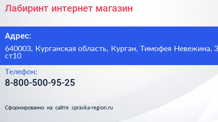 Лабиринт, интернет-магазин по адресу 640003, Курганская область, Курган, Тимофея Невежина, 3 ст10 в дальнейшем Организация, размещена в следующих категориях: