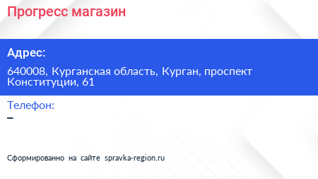 Прогресс, магазин по адресу 640008, Курганская область, Курган, проспект Конституции, 61 в дальнейшем Организация, размещена в следующих категориях: