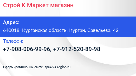 Строй К-Маркет, магазин по адресу 640018, Курганская область, Курган, Савельева, 42 в дальнейшем Организация, размещена в следующих категориях: