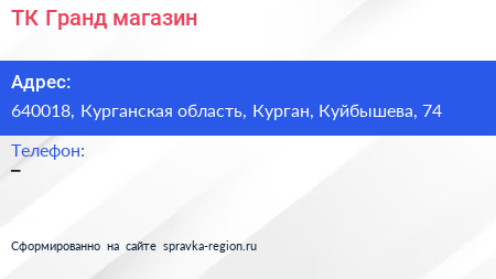 ТК Гранд, магазин по адресу 640018, Курганская область, Курган, Куйбышева, 74 в дальнейшем Организация, размещена в следующих категориях: