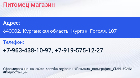 Питомец, магазин по адресу 640002, Курганская область, Курган, Гоголя, 107 в дальнейшем Организация, размещена в следующих категориях: