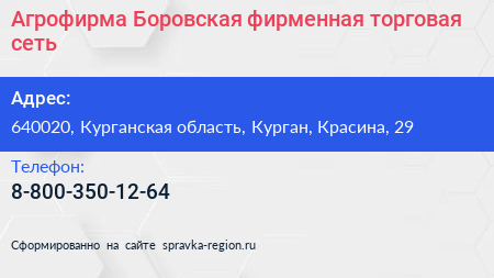Агрофирма Боровская, фирменная торговая сеть по адресу 640020, Курганская область, Курган, Красина, 29 в дальнейшем Организация, размещена в следующих категориях: