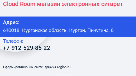 Cloud Room, магазин электронных сигарет по адресу 640018, Курганская область, Курган, Пичугина, 8 в дальнейшем Организация, размещена в следующих категориях: