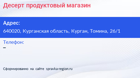 Десерт, продуктовый магазин по адресу 640020, Курганская область, Курган, Томина, 26/1 в дальнейшем Организация, размещена в следующих категориях: