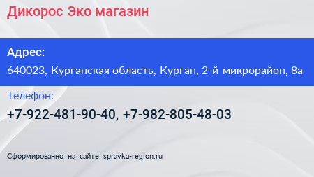 Дикорос Эко, магазин по адресу 640023, Курганская область, Курган, 2-й микрорайон, 8а в дальнейшем Организация, размещена в следующих категориях: