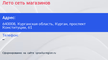 Лето, сеть магазинов по адресу 640008, Курганская область, Курган, проспект Конституции, 61 в дальнейшем Организация, размещена в следующих категориях: