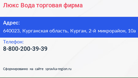 Люкс Вода, торговая фирма по адресу 640023, Курганская область, Курган, 2-й микрорайон, 10а в дальнейшем Организация, размещена в следующих категориях: