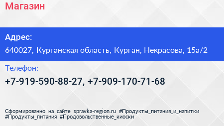Магазин по адресу 640027, Курганская область, Курган, Некрасова, 15а/2 в дальнейшем Организация, размещена в следующих категориях: