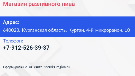 Магазин разливного пива по адресу 640023, Курганская область, Курган, 4-й микрорайон, 10 в дальнейшем Организация, размещена в следующих категориях: