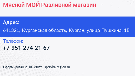 Мясной МОЙ Разливной, магазин по адресу 641321, Курганская область, Курган, улица Пушкина, 1Б в дальнейшем Организация, размещена в следующих категориях:
