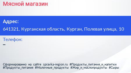 Мясной, магазин по адресу 641321, Курганская область, Курган, Полевая улица, 10 в дальнейшем Организация, размещена в следующих категориях: