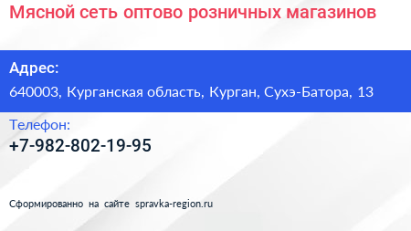 Мясной, сеть оптово-розничных магазинов по адресу 640003, Курганская область, Курган, Сухэ-Батора, 13 в дальнейшем Организация, размещена в следующих категориях: