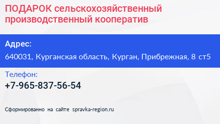 ПОДАРОК, сельскохозяйственный производственный кооператив по адресу 640031, Курганская область, Курган, Прибрежная, 8 ст5 в дальнейшем Организация, размещена в следующих категориях: