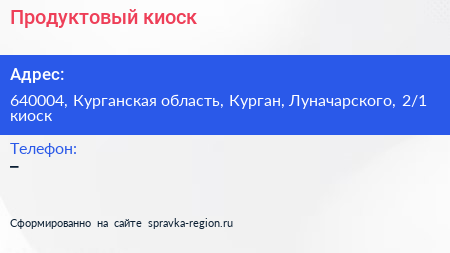 Продуктовый киоск по адресу 640004, Курганская область, Курган, Луначарского, 2/1 киоск в дальнейшем Организация, размещена в следующих категориях: