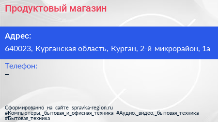 Продуктовый магазин по адресу 640023, Курганская область, Курган, 2-й микрорайон, 1а в дальнейшем Организация, размещена в следующих категориях: