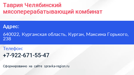 Таврия, Челябинский мясоперерабатывающий комбинат по адресу 640022, Курганская область, Курган, Максима Горького, 238 в дальнейшем Организация, размещена в следующих категориях: