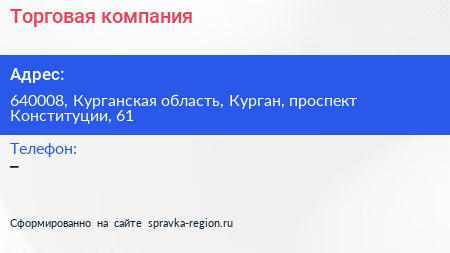 Торговая компания по адресу 640008, Курганская область, Курган, проспект Конституции, 61 в дальнейшем Организация, размещена в следующих категориях: