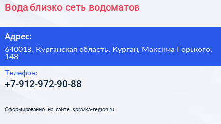 Вода близко, сеть водоматов по адресу 640018, Курганская область, Курган, Максима Горького, 148 в дальнейшем Организация, размещена в следующих категориях: