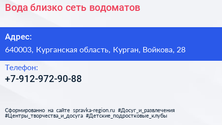 Вода близко, сеть водоматов по адресу 640003, Курганская область, Курган, Войкова, 28 в дальнейшем Организация, размещена в следующих категориях: