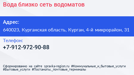 Вода близко, сеть водоматов по адресу 640023, Курганская область, Курган, 4-й микрорайон, 31 в дальнейшем Организация, размещена в следующих категориях: