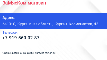 ЗаМясКом, магазин по адресу 641310, Курганская область, Курган, Космонавтов, 42 в дальнейшем Организация, размещена в следующих категориях: