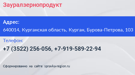 Зауралзернопродукт по адресу 640014, Курганская область, Курган, Бурова-Петрова, 103 в дальнейшем Организация, размещена в следующих категориях: