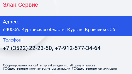 Злак-Сервис по адресу 640006, Курганская область, Курган, Кравченко, 55 в дальнейшем Организация, размещена в следующих категориях: