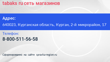 tabaks.ru, сеть магазинов по адресу 640023, Курганская область, Курган, 2-й микрорайон, 17 в дальнейшем Организация, размещена в следующих категориях: