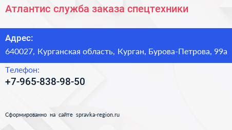 Атлантис, служба заказа спецтехники по адресу 640027, Курганская область, Курган, Бурова-Петрова, 99а в дальнейшем Организация, размещена в следующих категориях: