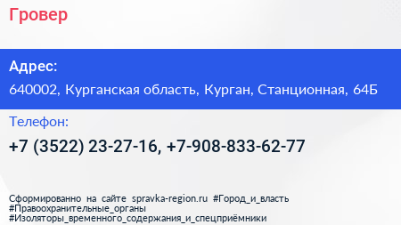 Гровер по адресу 640002, Курганская область, Курган, Станционная, 64Б в дальнейшем Организация, размещена в следующих категориях: