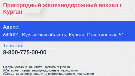 Пригородный железнодорожный вокзал, г. Курган по адресу 640001, Курганская область, Курган, Станционная, 51 в дальнейшем Организация, размещена в следующих категориях: