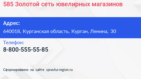 585 Золотой, сеть ювелирных магазинов по адресу 640018, Курганская область, Курган, Ленина, 30 в дальнейшем Организация, размещена в следующих категориях: