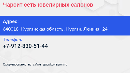 Чароит, сеть ювелирных салонов по адресу 640018, Курганская область, Курган, Ленина, 24 в дальнейшем Организация, размещена в следующих категориях: