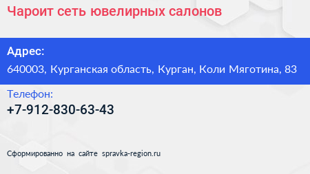 Чароит, сеть ювелирных салонов по адресу 640003, Курганская область, Курган, Коли Мяготина, 83 в дальнейшем Организация, размещена в следующих категориях: