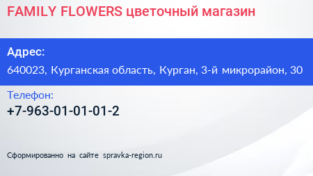 FAMILY FLOWERS, цветочный магазин по адресу 640023, Курганская область, Курган, 3-й микрорайон, 30 в дальнейшем Организация, размещена в следующих категориях: