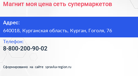 Магнит моя цена, сеть супермаркетов по адресу 640018, Курганская область, Курган, Гоголя, 76 в дальнейшем Организация, размещена в следующих категориях: