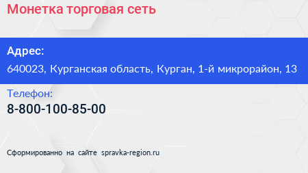 Монетка, торговая сеть по адресу 640023, Курганская область, Курган, 1-й микрорайон, 13 в дальнейшем Организация, размещена в следующих категориях: