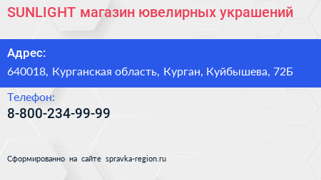 SUNLIGHT, магазин ювелирных украшений по адресу 640018, Курганская область, Курган, Куйбышева, 72Б в дальнейшем Организация, размещена в следующих категориях: