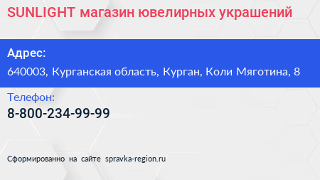 SUNLIGHT, магазин ювелирных украшений по адресу 640003, Курганская область, Курган, Коли Мяготина, 8 в дальнейшем Организация, размещена в следующих категориях: