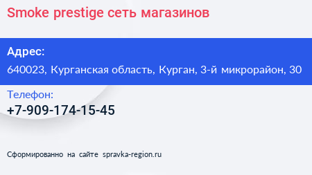 Smoke prestige, сеть магазинов по адресу 640023, Курганская область, Курган, 3-й микрорайон, 30 в дальнейшем Организация, размещена в следующих категориях: