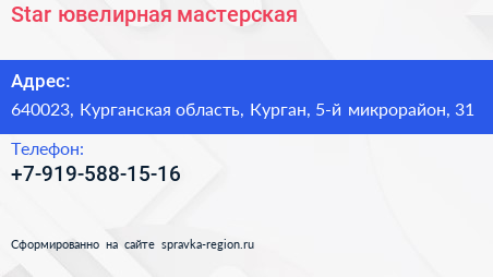Star, ювелирная мастерская по адресу 640023, Курганская область, Курган, 5-й микрорайон, 31 в дальнейшем Организация, размещена в следующих категориях:
