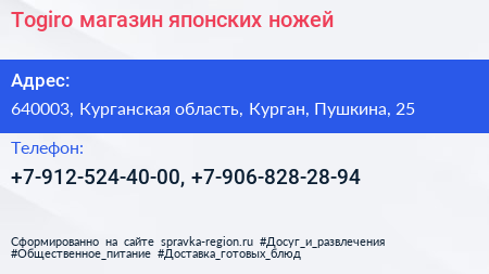 Togiro, магазин японских ножей по адресу 640003, Курганская область, Курган, Пушкина, 25 в дальнейшем Организация, размещена в следующих категориях: