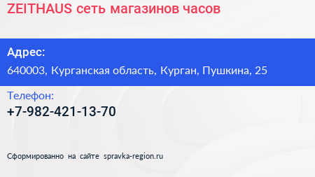 ZEITHAUS, сеть магазинов часов по адресу 640003, Курганская область, Курган, Пушкина, 25 в дальнейшем Организация, размещена в следующих категориях: