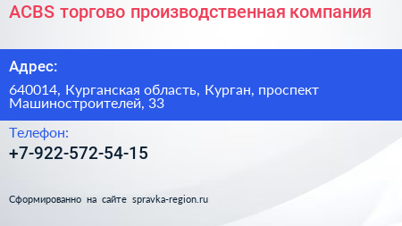 ACBS, торгово-производственная компания по адресу 640014, Курганская область, Курган, проспект Машиностроителей, 33 в дальнейшем Организация, размещена в следующих категориях: