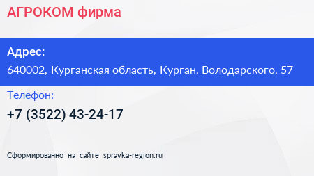 АГРОКОМ, фирма по адресу 640002, Курганская область, Курган, Володарского, 57 в дальнейшем Организация, размещена в следующих категориях: