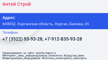 Антей Строй по адресу 640032, Курганская область, Курган, Бажова, 65 в дальнейшем Организация, размещена в следующих категориях: