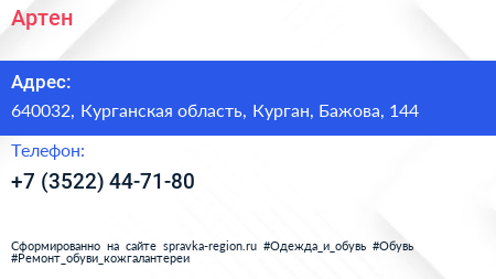 Артен по адресу 640032, Курганская область, Курган, Бажова, 144 в дальнейшем Организация, размещена в следующих категориях: