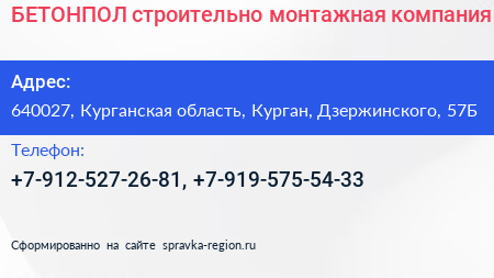 БЕТОНПОЛ, строительно-монтажная компания по адресу 640027, Курганская область, Курган, Дзержинского, 57Б в дальнейшем Организация, размещена в следующих категориях: