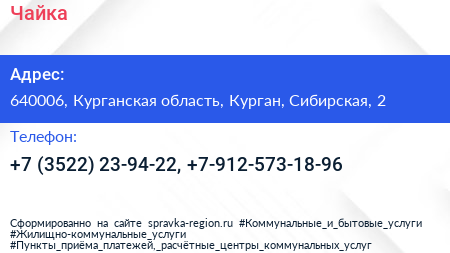 Чайка по адресу 640006, Курганская область, Курган, Сибирская, 2 в дальнейшем Организация, размещена в следующих категориях: